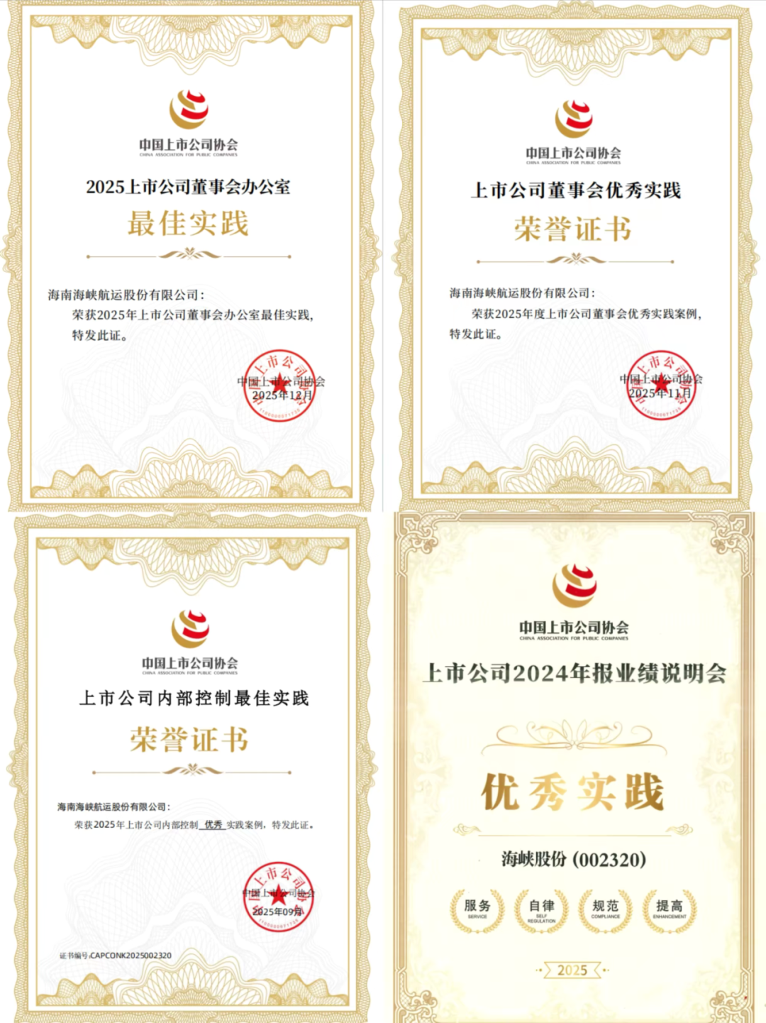 凭借治理全链条的扎实实践、突出成效及对规范运作与高质量发展的持续践行,海峡股份获得全国性上市公司自律组织——中国上市公司协会颁发的董事会办公室最佳实践、董事会优秀实践案例、内部控制优秀实践案例、业绩说明会优秀实践等4项荣誉,充分彰显在治理机制与合规实践上的综合竞争优势。