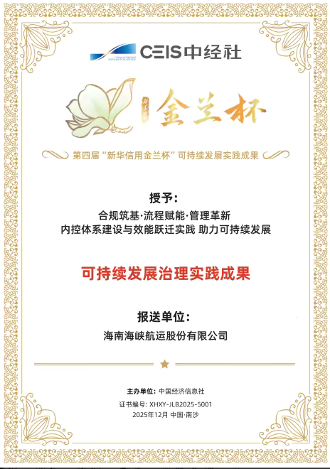 荣获中国经济信息社第四届“新华信用金兰杯”可持续发展优秀案例。荣获本次入选印证出海峡股份在可持续发展治理、绿色运营等领域的扎实成效,凸显航运业务与生态环保的协同发展能力。海峡股份未来将持续深耕可持续发展领域,依托本次新华信用专业背书进一步提升企业资本市场公信力。