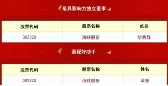 ]article_adlist-->2025年,海峡股份聚焦专业领域,依托坚实的履职技能和高效的团队协作,打造专业赋能的核心力量,为公司客滚运输业务板块持续高质量发展提供稳固保障。董事长王然荣获2025年上证鹰·金质量“卓越企业家”称号;总经理蔡泞检荣获2025年上证鹰·金质量“优秀董秘”及中国上市公司协会董事会秘书履职评价5A评级;副总经理、董事会秘书张芬芬荣获财联社2025年鸾鹭第六届精英董秘奖;独立董事胡秀群、证券部/法务部部长梁婕分别荣获二十届中国上市公司董事会金圆桌奖“最具影响力独立董事”及“董秘好助手”。