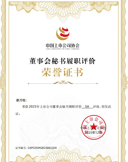 荣获价值在线2025年上市公司卓越投关建设奖。作为资本市场专业服务机构,价值在线的评选聚焦上市公司投关体系搭建与实践成效,是衡量行业投关建设水平的重要参考。