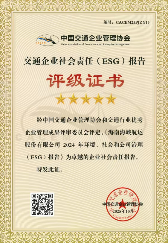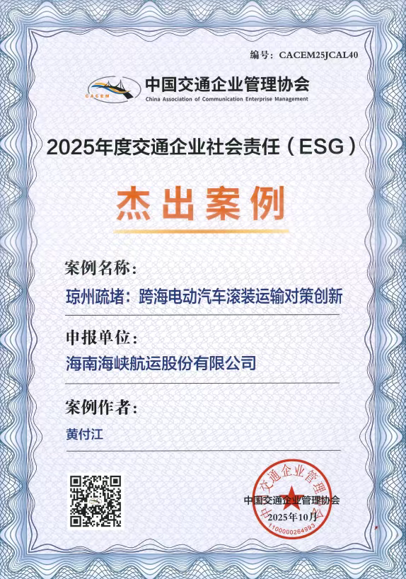 荣获中国交通企业管理协会两项殊荣:《2024年度ESG报告》获评“卓越报告”,《琼州疏堵:跨海电动汽车滚装运输对策创新》入选“典型案例”。作为交通运输领域的权威行业组织,该协会评选聚焦企业ESG实践质量,是衡量交通企业综合发展水平的重要行业标尺。